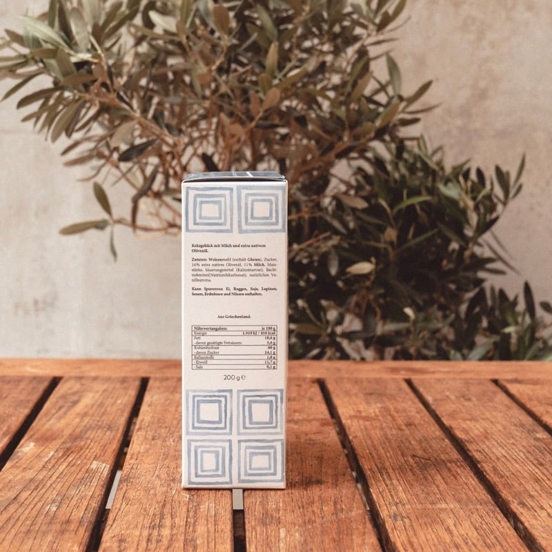 Zutaten: Weizenmehl (enthält Gluten), Zucker, 14 % extra natives Olivenöl, 11 % Milch, Maisstärke, Säuerungsmittel (Kaliumtartrat), Backtriebmittel (Natriumbikarbonat), natürliches Vanillearoma.